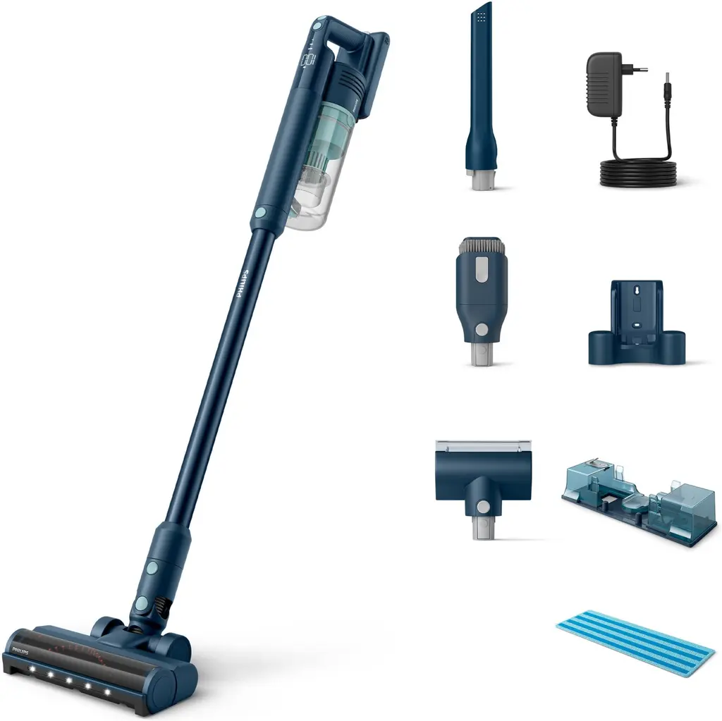PHILIPS Aqua 5000 XC5141/01 został zaprojektowany z myślą o wszechstronności – odłączany odkurzacz ręczny pozwala na wygodne czyszczenie mebli, tapicerki czy trudno dostępnych miejsc. Możliwość wymiany baterii przedłuża żywotność urządzenia, a poziom hałasu na poziomie 84 dB zapewnia komfort użytkowania.