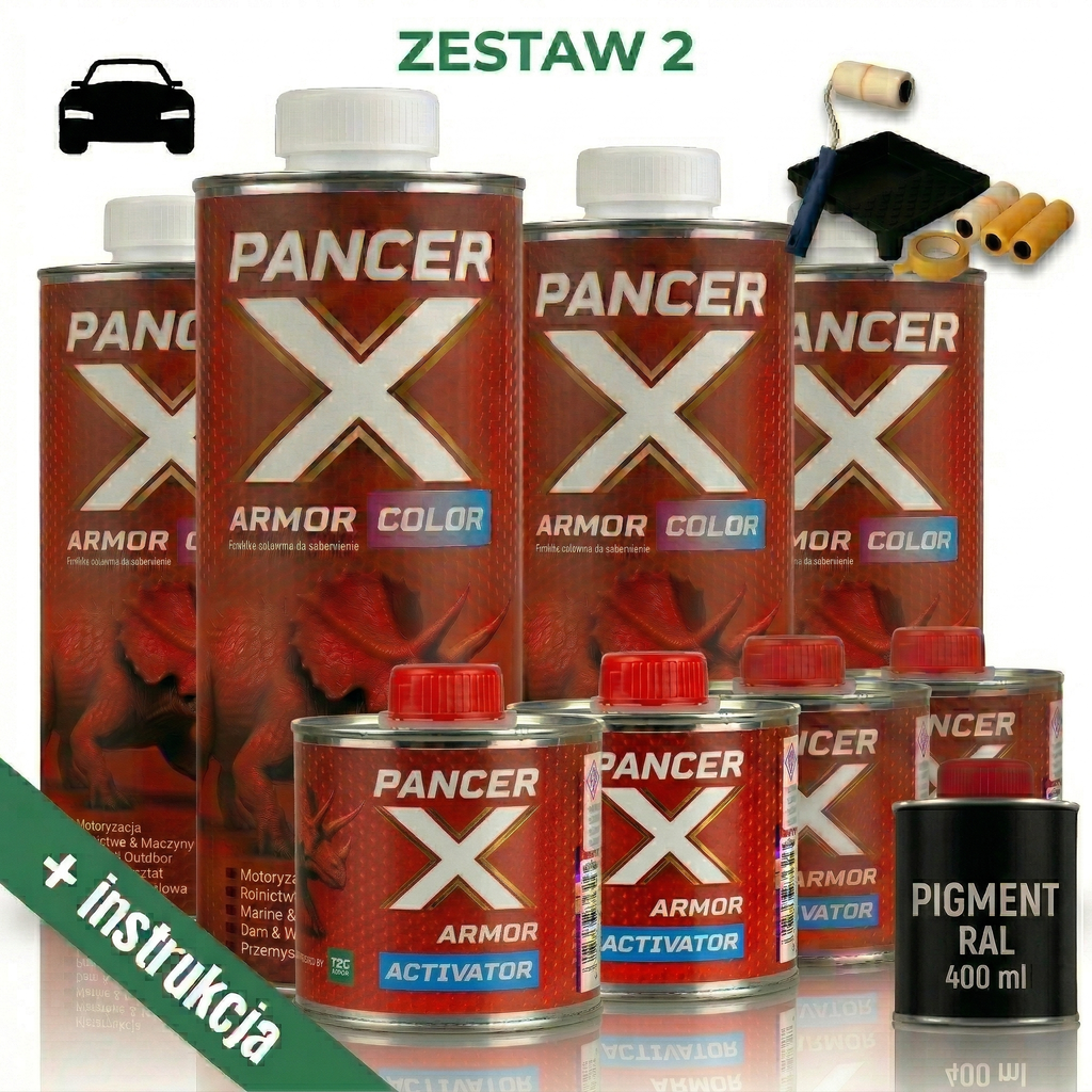 2x 600 ml powłoki, 2x 200 ml utwardzacza, 2x 100 ml pigmentu, 1x komplet dodatków