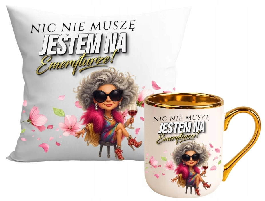 **Nic nie muszę jestem na emeryturze – poduszka, złota filiżanka.**