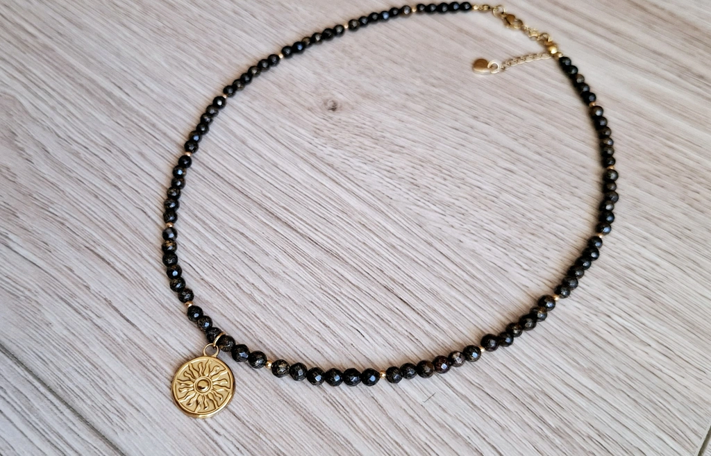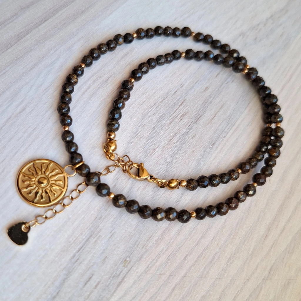 Naszyjnik wykonany z powlekanej stali chirurgicznej -kolor złoty i kamieni naturalnych - bronzyt.