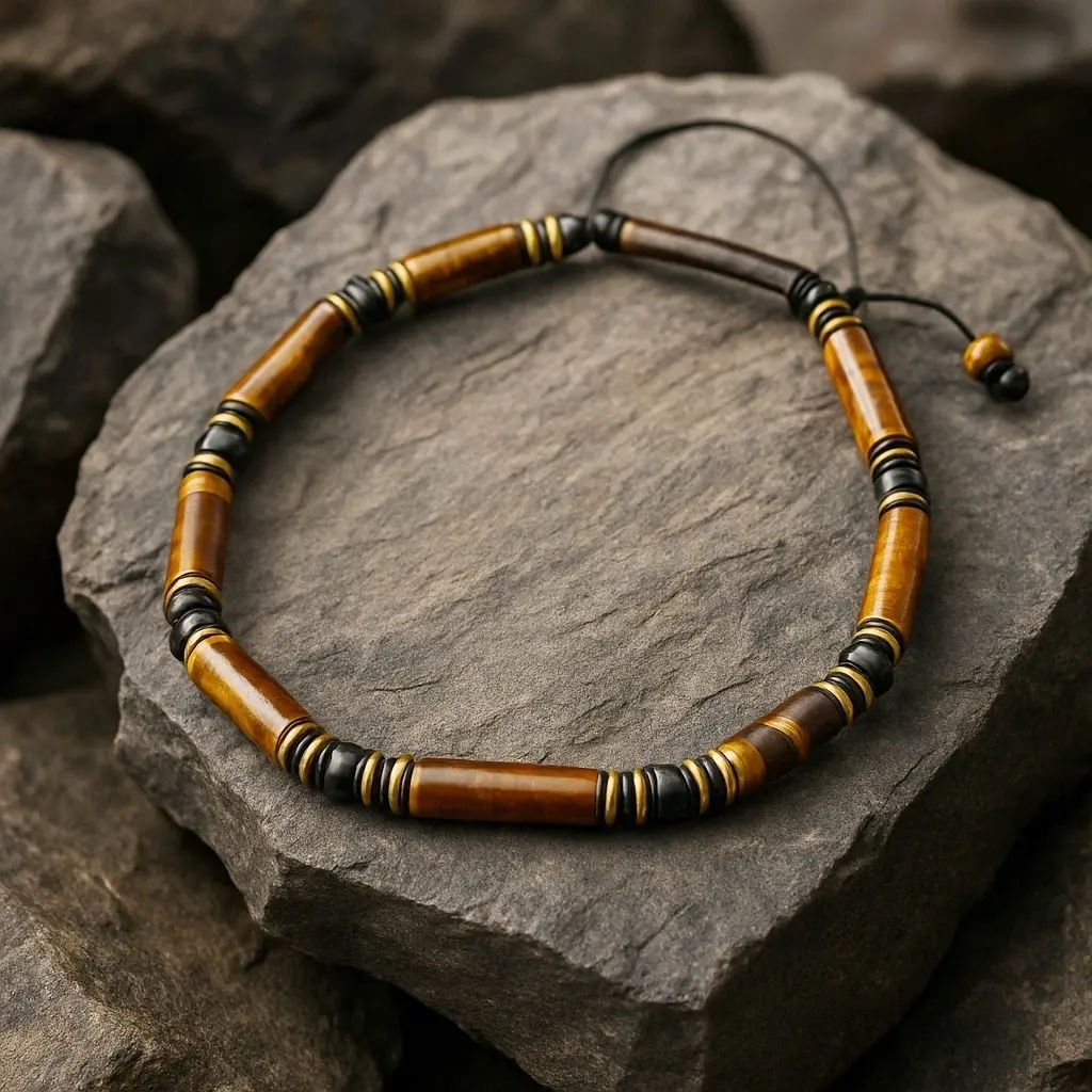 Bransoletka wykonana z naturalnych kamieni – tygrysiego oka, bronzytu, onyksu i hematytu – osadzonych na wytrzymałym, nylonowym sznurku jubilerskim. Dzięki regulowanemu zapięciu pasuje na nadgarstki o obwodzie od 18 do 20 cm. Każdy egzemplarz jest unikalny, ponieważ kamienie mogą różnić się odcieniem i układem wzorów. Minimalistyczny design sprawia, że bransoletka stanowi uniwersalny dodatek zarówno na co dzień, jak i podczas aktywności na świeżym powietrzu. Dostępny rozmiar: uniwersalny. Sprawdź, czy to też będzie Twój must-have.