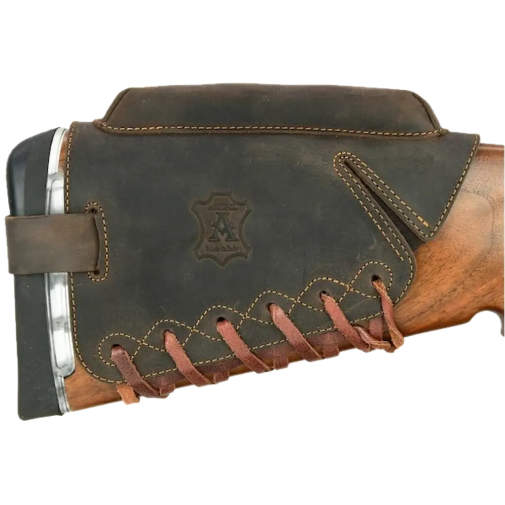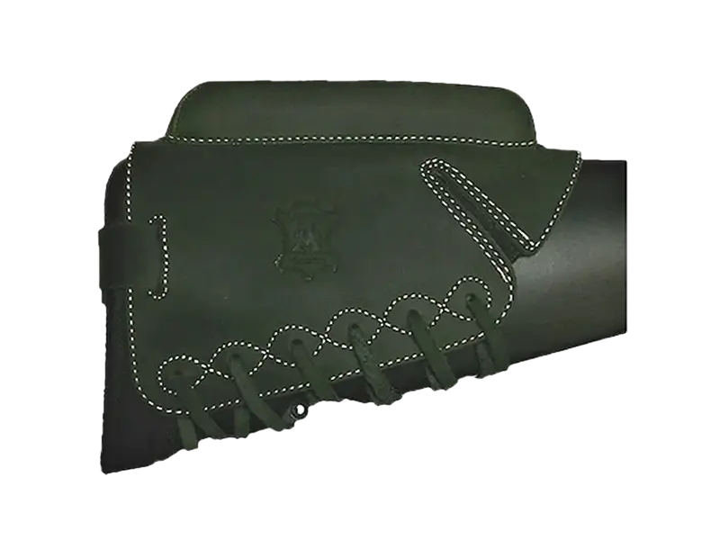 Skórzana osłona kolby z podwyższającą poduszką policzkową. Do użytku z celownikami optycznymi. Możliwość dostosowania do każdego rozmiaru kolby. Przed zsunięciem zabezpieczona skórzanym paskiem przesuwanym przez klamrę. Z wodoodpornym wykończeniem, skóra nubuk. Dostępne z trzema wysokościami poduszki policzkowej.