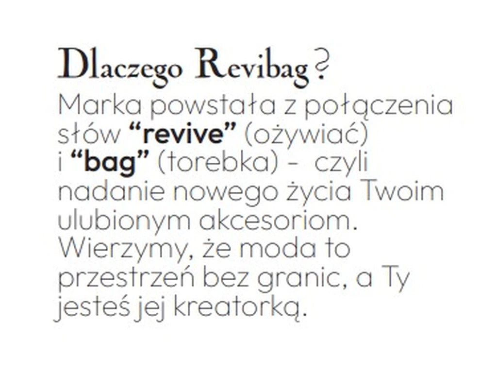 Marka powstała z połączenia słów “revive” (ożywiać) i “bag” (torebka) - czyli nadanie nowego życia Twoim ulubionym akcesoriom. Wierzymy, że moda to przestrzeń bez granic, a Ty jesteś jej kreatorką.