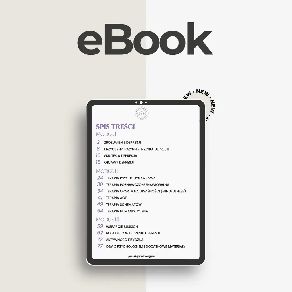 Depresja – workbook, który pomoże Ci ją zrozumieć i zacząć działać Dlaczego warto wiedzieć o niej więcej? Depresja to nie jest zwykły smutek, który mija po kilku dniach. To stan, który potrafi trwać tygodniami, a nawet miesiącami, odbierając radość życia i motywację. Bywa, że przychodzi powoli i przez długi czas pozostaje niezauważona. Czujesz się zmęczony, przytłoczony i bez energii, choć nie zawsze umiesz to nazwać. Mogą pojawić się także problemy ze snem, jedzeniem czy koncentracją. Depresja często sprawia, że czujesz się samotny i winny, choć przecież to nie Twoja wina. Dlatego tak ważne jest, by dowiedzieć się, skąd bierze się ten stan i jakie mechanizmy za nim stoją. Jak ten workbook pomoże Ci w walce z depresją? Ten workbook to praktyczne narzędzie stworzone z myślą o osobach, które chcą lepiej zrozumieć depresję i znaleźć sposoby na poprawę swojego samopoczucia. Dzięki prostym wyjaśnieniom dowiesz się, skąd mogą brać się Twoje myśli i reakcje. Nauczysz się rozpoznawać, co Cię napina i przytłacza. Workbook pokazuje też, jak krok po kroku wprowadzać zmiany, które wspierają proces zdrowienia. Nie zastąpi terapii, ale może być cennym wsparciem – bezpiecznym miejscem, gdzie w swoim tempie uporządkujesz emocje. Co znajdziesz w tym workbooku o depresji? W środku znajdziesz omówienie przyczyn i objawów depresji, które pomogą Ci lepiej zrozumieć, przez co przechodzisz. Poznasz także różne podejścia terapeutyczne, takie jak terapia poznawczo-behawioralna, ACT, psychodynamiczna czy techniki mindfulness. Dowiesz się, jak dieta i ruch wpływają na Twoje samopoczucie. Workbook zawiera ćwiczenia, które pomagają zatrzymać negatywne myśli, zmniejszyć napięcie i zacząć budować zdrowsze schematy. Znajdziesz w nim również miejsce na własne zapiski – w ten sposób możesz prowadzić dziennik emocji i śledzić swoje postępy. Na końcu czeka krótkie Q&A z psychologiem, które odpowiada na najczęściej zadawane pytania. Jeśli chcesz, możesz także przeczytać, co o leczeniu depresji pisze Mayo Clinic – to rzetelne źródło wiedzy medycznej w języku angielskim. Depresja to poważny temat – ale możesz zrobić pierwszy krok Ten workbook został oparty na sprawdzonych metodach terapeutycznych i psychoedukacyjnych. Dzięki niemu łatwiej będzie Ci zrozumieć, co się z Tobą dzieje i dlaczego czujesz się tak, a nie inaczej. Małe zmiany w codziennych nawykach, które zaproponuje Ci workbook, mogą w dłuższej perspektywie przynieść dużą poprawę. Nie musisz czekać – workbook jest dostępny od razu po zakupie, więc możesz zacząć pracować nad sobą już dziś. Jeśli rozważasz dodatkowe wsparcie, sprawdź naszą ofertę psychoterapii online, która może być kolejnym ważnym krokiem w walce z depresją. Pobierz workbook i daj sobie szansę na zmianę Nie odkładaj troski o siebie na później. Nawet drobne kroki mają znaczenie i z czasem mogą dać wielkie efekty. Pobierz workbook i przekonaj się, że możesz zacząć odzyskiwać kontrolę nad swoim życiem, nawet jeśli teraz wydaje Ci się to bardzo trudne.