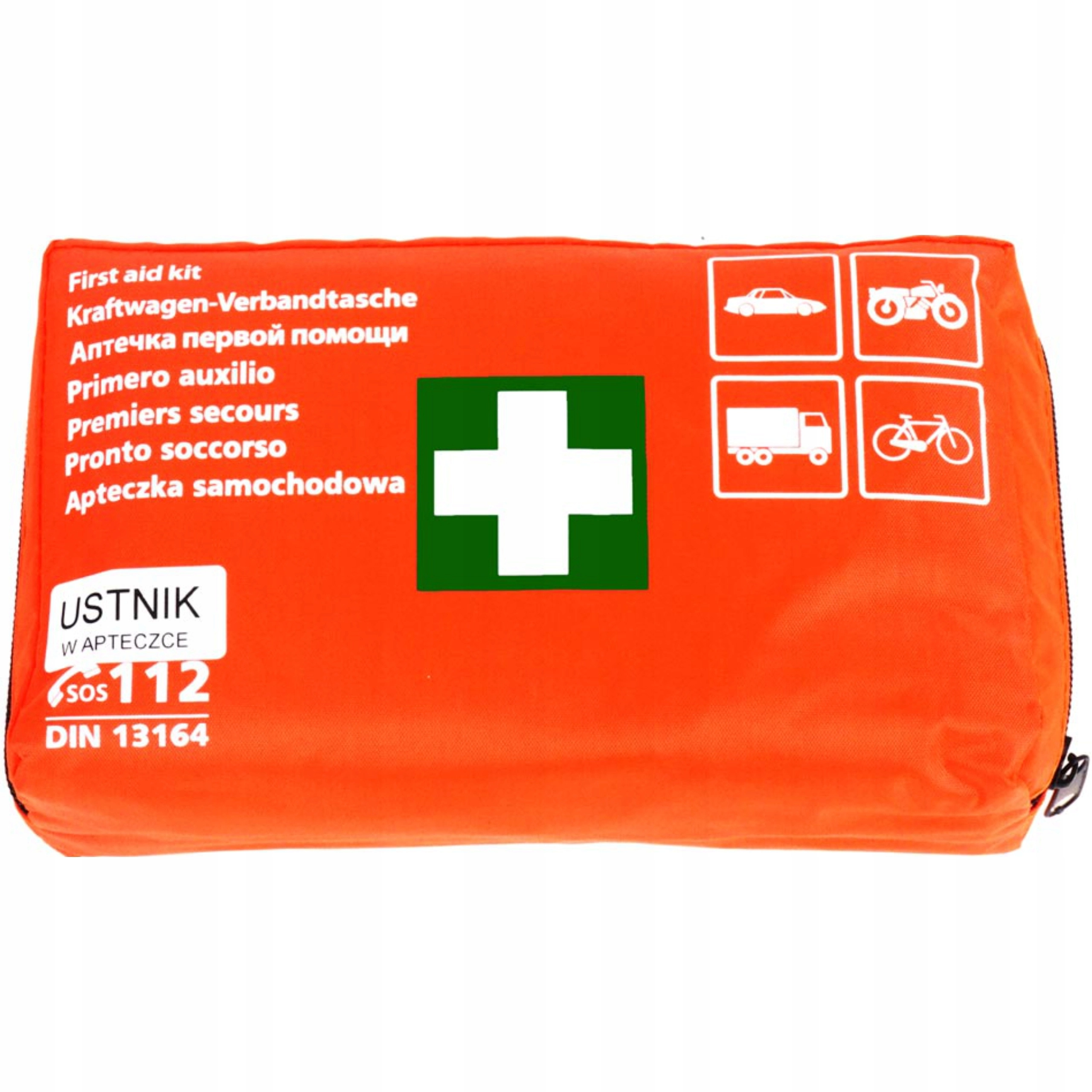 Poręczna apteczka pierwszej pomocy do samochodu, spełniająca normy wyposażenia zgodne ze standardem DIN 13164 z ustnikiem w zestawie. Wyróżniona odznaczeniem jakości roku 2012 r, apteczka wyposażona z zamek błyskawiczny oraz rzepy na tyle apteczki do umocowania w samochodzie.